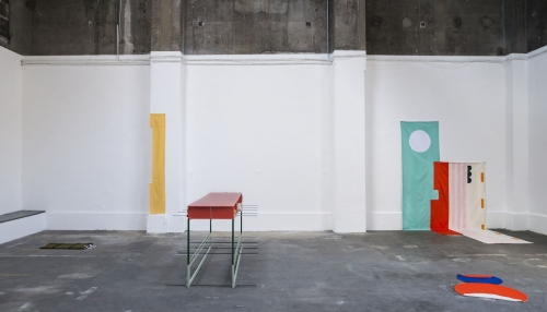 Ce travail consiste en des sculptures molles que j'ai choisies de traiter comme des peintures.Il s'agit d'aplats de tissus de couleurs qui se superposent et s'enchevêtrent au sol,sans aucune transparence -les tissus étant absolument opaques. C'est une manière de contraindre le geste pictural par un matériau industriel imposant un choix de nuances de coloris restreints. Aussi, la couleur est-elle indissociable de la toile,jamais appliquée en surface car incorporée dans la masse de la fibre textile. Les espaces pliables ont été pensés pour être agencés,modulés et adaptables au contexte ainsi qu'au lieu de l'exposition.Ces tissus prennent vie par leur déploiement. Ils sont cousus de manière à contraindre la manipulation. Lorsque je les plie et les déplie, des gestes précis sont appliqués, renvoyant au rituel du pliage d'un kimono autant qu'à la cérémonie du drapeau.